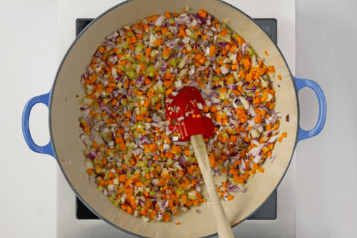 Обжарить бекон, розмарин, чеснок и овощи, изредка помешивая, в течение 10–15 минут или пока они не покроются ровной золотистой корочкой.