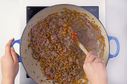 Добавить фарш и обжаривать на сильном огне 5–10 минут, разбивая комки лопаткой. Добавить томаты, томатное пюре, уксус и лавровый лист. Тем временем развести бульонный кубик в 400 мл горячей воды. Влить бульон к фаршу, как следует перемешать и дать закипеть. Добавить перец, убавить огонь до минимума, накрыть крышкой и томить в течение 1 часа, помешивая время от времени. Снять крышку и готовить еще 15–20 минут, пока влага не выпарится и соус не загустеет.