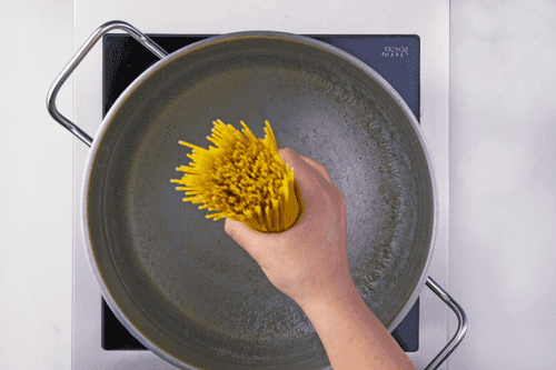 В кипящей подсоленной воде отварить спагетти до состояния аль денте. Когда паста приготовится, слить воду, оставив 1 стакан в стороне.