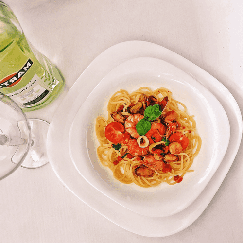 Паста с морепродуктами в томатном соусе с белым вином