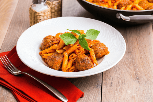 Митболы из говядины с пенне в пикантном томатном соусе