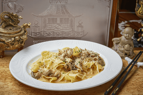 Папарделле с телятиной и грибами – истинное воплощение итальянской гастрономической утончённости. Широкие полоски пасты, созданные для обволакивания соуса, идеально сочетаются с нежной телятиной и ароматными вешенками. Это блюдо олицетворяет домашний уют Тосканы, где его корни уходят в деревенские традиции. Насыщенный соус на основе демигласа и сливок дарит богатый вкус с глубокой мясной основой, оттеняемый чесноком и тимьяном. Завершает композицию тертый пармезан, придавая характерную пикантность и завершённость. Такое блюдо идеально подойдёт для душевного ужина, когда хочется окунуться в атмосферу итальянского гостеприимства и насладиться гармонией вкусов. Простота приготовления сочетается с ресторанным качеством – это достойный выбор как для семейных вечеров, так и для праздничных ужинов.