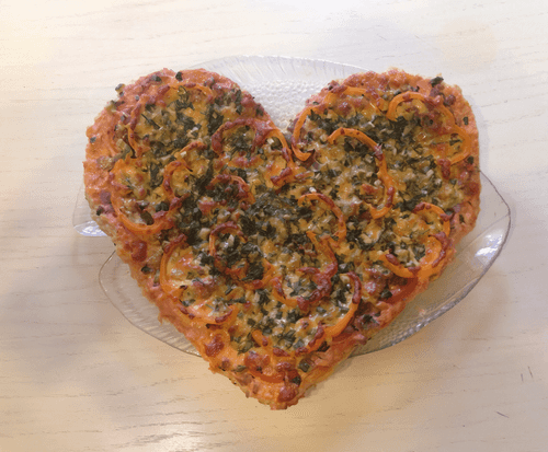 Из фарша на противне сформировать основу для пиццы толщиной немного меньше сантиметра (я сделал в форме сердца)