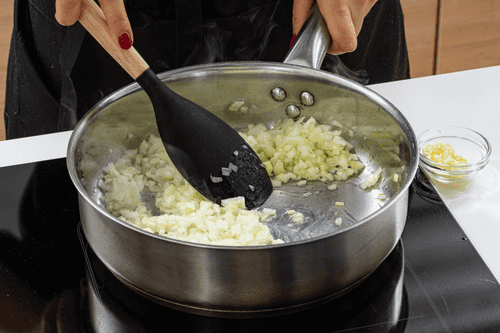 В той же сковороде разогреть оливковое масло и обжарить в нем лук до мягкости. В самом конце добавить чеснок.