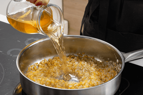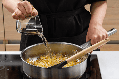 Всыпать булгур в сковороду к овощам, залить вином и тушить 2 минуты.