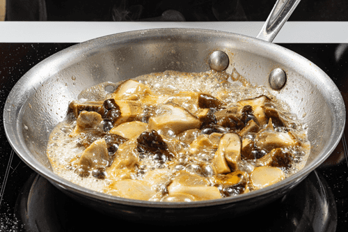 Когда грибы подрумянятся, залить их сливками и тушить на слабом огне 10 минут.