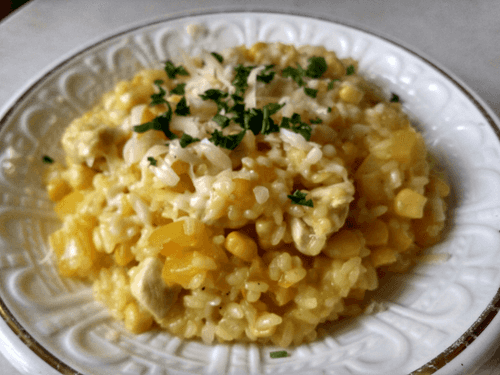 Ризотто с курицей — это классическое блюдо итальянской кухни, сочетающее в себе нежность куриного филе, кремовую текстуру арборио и насыщенный аромат специй. Изначально ризотто появилось в северных регионах Италии, где рис был основой многих традиционных блюд. Белое вино и шафран придают этому варианту утонченный вкус с легкой сладостью и теплым оттенком специй. Желтый сладкий перец и кукуруза добавляют сочность и яркость, а тертый пармезан завершает картину мягкой сливочностью. Это блюдо идеально подойдет для уютного ужина, напоминая о домашнем тепле и итальянской гастрономической традиции. Лучшее сочетание — с бокалом белого вина и свежей зеленью, подчеркивающей насыщенность вкуса.