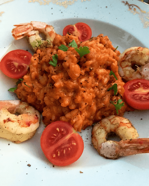 Томатное ризотто с креветками и помидорами черри