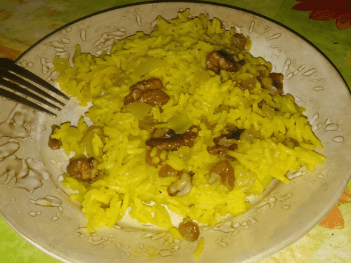 Влить 200-250 мл воды, добавить изюм, шафран, соль, перемешать и тушить на слабом огне до готовности.
