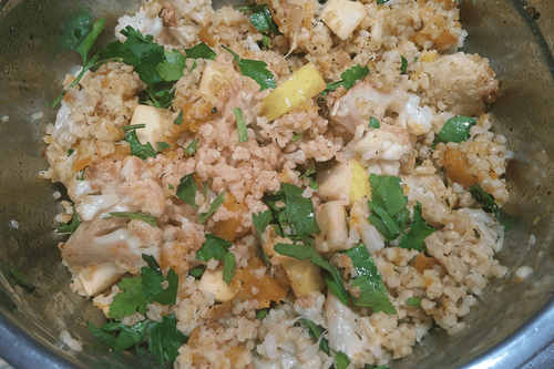 В глубоком салатнике смешать запеченные овощи, булгур, яблоко, посыпать петрушкой и залить заправкой.