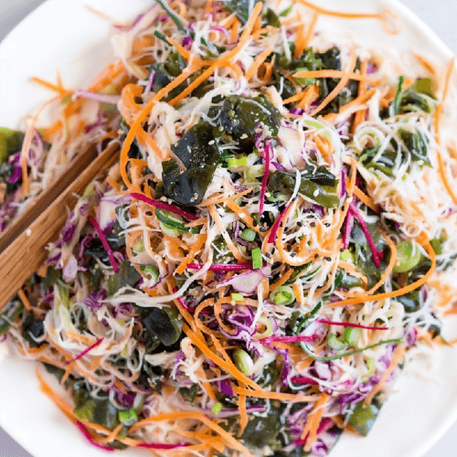 Веганский салат с рисовой лапшой и кунжутной заправкой