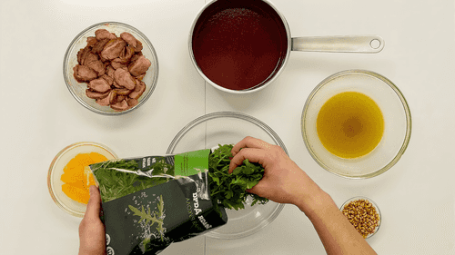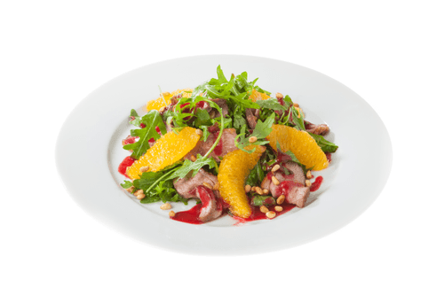 Салат с утиной грудкой, рукколой и клюквенным соусом