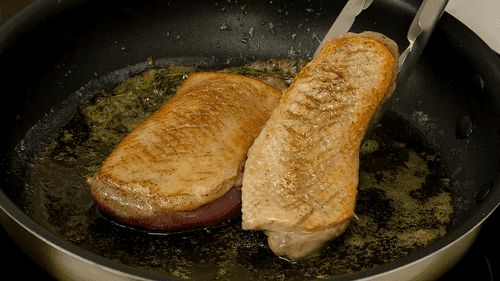Слегка надрезать кожу на утиной грудке, посолить, поперчить и смазать оливковым маслом. На сковороде разогреть 15 г сливочного масла и 10 мл оливкового на медленном огне. Положить тимьян, утку положить кожей вниз и жарить в течение 4-5 минут не переворачивая, нужно добиться золотистого цвета кожи. Затем перевернуть и, увеличив огонь, обжарить мясо со всех сторон по 2-3 минуты.
