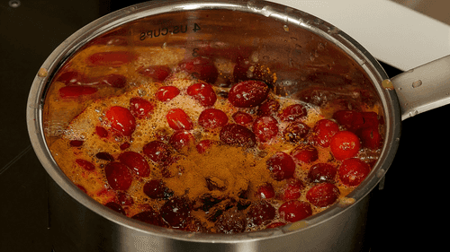 В сотейнике подогреть клюкву с соком одного апельсина, корицей и бадьяном в течение пяти минут. Затем протереть клюкву через сито, к получившемуся пюре добавить 50 мл воды, снова поставить на огонь, посолить, поперчить и добавить 15 г сливочного масла. Помешивать в течение 30 секунд до однородной консистенции.