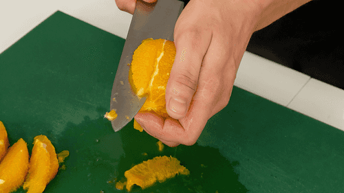 С апельсина ножом срезать кожу, и вырезать красивые филе, избегая белых пленок. Обрезки апельсина не выбрасывать.