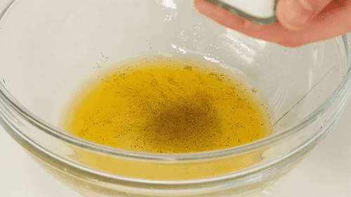 Выжать сок из обрезков апельсина, добавить мед, уксус, соль и перец, взбить. Затем, не переставая взбивать, влить 50 мл оливкового масла.