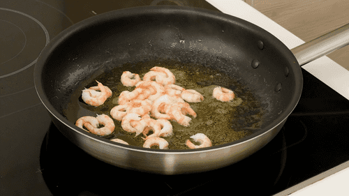 На смеси сливочного и оливкового масел обжарить креветки в течение 1–2 минут, добавить измельченный чеснок, как только появится аромат, влить вино и выпарить его в течение 30 секунд, затем снять с огня.