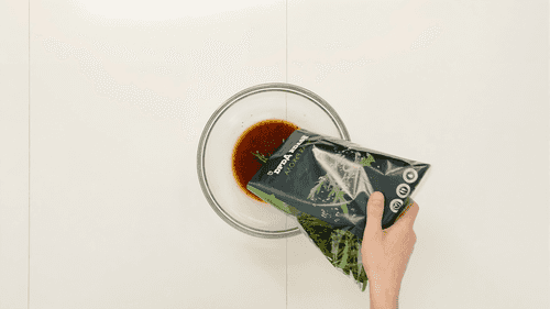 Смешать красный винный и бальзамический уксусы с оливковым маслом, перцем и солью при помощи венчика. Смешать рукколу с соусом.