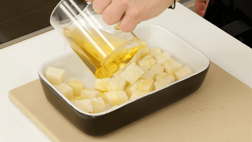 С хлеба срезать корки и нарезать его крупным кубиком. Переложить на противень, сбрызнуть кунжутным маслом, посолить, поперчить и отправить в духовку, разогретую до 180 градусов, на 20 минут.