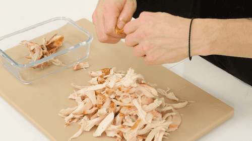 Копченую курицу разорвать на волокна или нарезать крупными кусочками, смешать мясо с соусом хойсин.