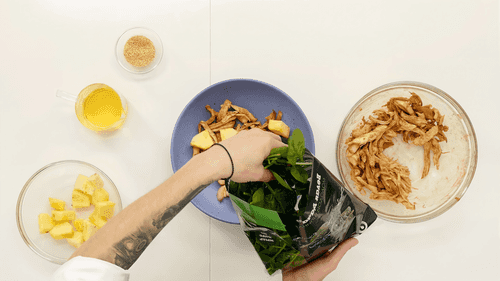 Выложить на тарелку листья шпината, на них кусочки ананаса, курицу с соусом и сухари, посыпать кунжутом.