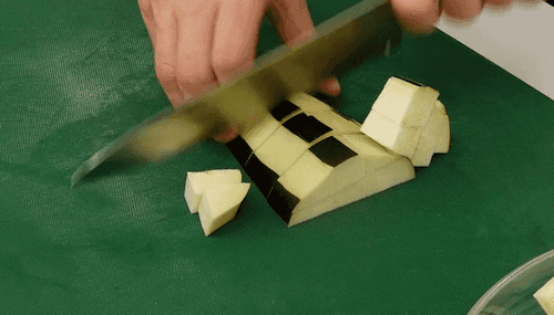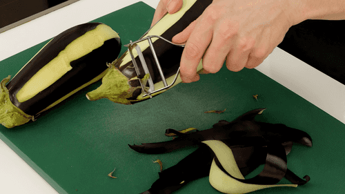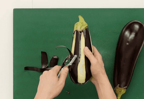 С баклажанов овощечисткой или ножом срезать вертикальные полосы кожуры. Так они будут лучше разминаться, но оставшаяся кожура даст необходимый вкус.