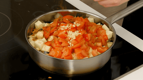 Добавить овощи, чеснок и специи, накрыть крышкой и готовить на небольшом огне 25 минут.