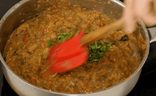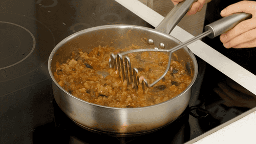 Снять крышку, размять овощи лопаткой до состояния однородного пюре, выпарить лишнюю жидкость и снять с огня.