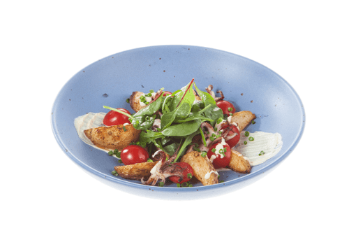 Теплый салат из кальмаров с сыром – это гастрономическое воплощение изысканности и утонченности. Его корни уходят в авторскую кухню, где сочетаются смелые вкусовые решения и гармония ингредиентов. Нежные кальмары и осьминоги, слегка обжаренные до золотистой корочки, создают идеальный дуэт с бархатистым сырным соусом, обогащенным лимонной свежестью. Запеченный молодой картофель придает блюду питательность и легкую хрусткость, а сочные помидоры черри добавляют яркие, освежающие ноты. Завершающий акцент – салатный микс, пропитанный каплей оливкового масла и посыпанный измельченным зеленым луком, создавая игру текстур и ароматов. Этот салат не только согревает, но и дарит настоящий праздник вкуса, идеально подходя к уютным семейным ужинам или изысканным гастрономическим экспериментам.