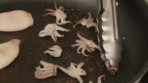 Смазать раскаленную сковороду оливковым маслом и обжарить кальмары и осьминоги по минуте с каждой стороны до румяной корочки. Выложить на бумажные салфетки.