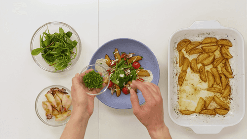 В порционную тарелку выложить две ложки теплого сырного соуса, на него выложить обжаренных кальмаров, сверху выложить микс, печеный картофель и половинки помидоров черри, посыпать измельченным зеленым луком.