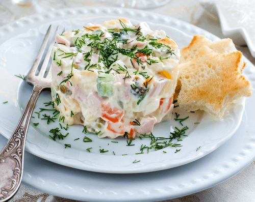 Салат с курицей и крабом — это изысканное блюдо, сочетающее нежность куриного филе с утонченным вкусом крабового мяса. Его корни уходят в авторскую кухню, где смелые сочетания создают новые гастрономические шедевры. Легкая сладость моркови и маринованных огурцов гармонирует с кремовым соусом из зелёного горошка, придавая салату особую свежесть. Подача в виде башенки делает его не только вкусным, но и эстетически привлекательным. Украшенный шнитт-луком и икрой летучей рыбы, он приобретает нотки праздничного блюда. Этот салат идеально подходит как для торжественных ужинов, так и для романтических встреч, удивляя своим богатым вкусом и элегантностью. Каждая вилка раскрывает новые грани его утончённого сочетания, оставляя незабываемые впечатления.