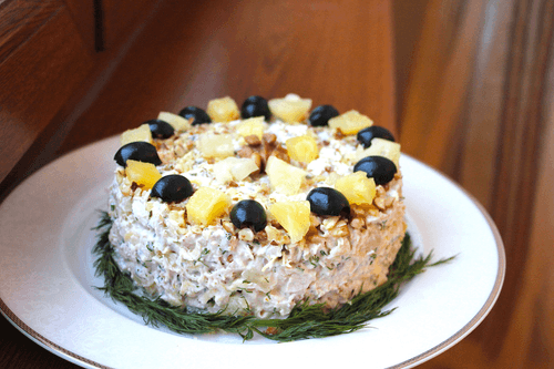 Украсить салат грецкими орехами, ананасами и маслинами.