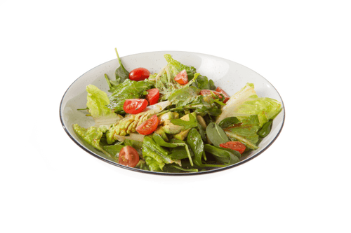 В большую миску нарвать салат романо, добавить листья шпината и руколы, добавить авокадо и черри, перемешать с соусом, поперчить по вкусу и подавать.