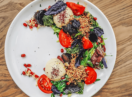 Выложить на блюдо полумесяцем слоями: сначала табуле, потом микс-салат, дольки томатов, базилик. Посыпать смесью лука фри, выложить 2 шарика хумуса, песто и свеклу. Приправить сумахом.