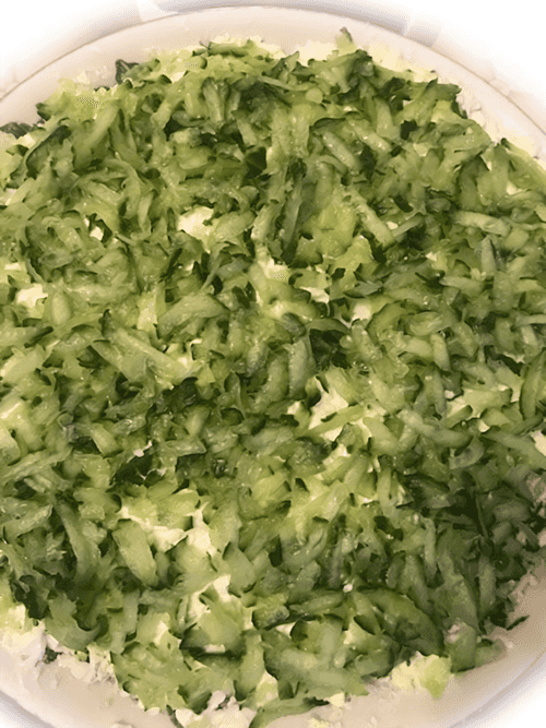 Повторить ту же последовательность с первого по четвертый слой. Затем, как только нанесли на последний слой майонез, сверху выложить свежий натертый отжатый огурец.