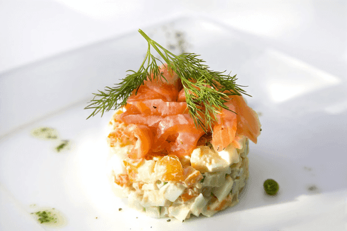 Оливье с лососем и картофелем — это изысканный вариант классического русского салата, который обретает новую глубину вкуса благодаря нежному слабосоленому лососю и сливочному соусу. История «Оливье» берет свое начало в XIX веке, когда французский шеф-повар Люсьен Оливье представил его московской публике. Со временем рецепт изменялся, а добавление рыбы придало ему свежесть и благородство. Вкус салата гармоничный: сочность картофеля и моркови сочетается с солоноватостью огурцов, а красная икра придает деликатесный акцент. Такой салат идеально подходит для торжественных ужинов и праздничных столов, удивляя гостей своим утонченным вкусом и богатством текстур.