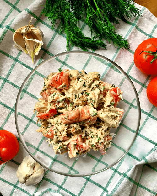 Этот салат – ода простоте и свежести европейской кухни. Нежное куриное филе, сочные помидоры, ароматный укроп и пикантный чеснок создают гармонию вкусов, которая дополняется нежной сметанной заправкой. История подобных салатов восходит к традициям домашней кухни, где ценятся натуральные продукты и легкость приготовления. Он обладает мягкой текстурой, сочностью от томатов и легкой сливочной ноткой от сметаны. Идеально подходит как самостоятельное блюдо, так и дополнение к основному столу, особенно в летнее время. Сочетание белкового куриного филе и свежих овощей делает его питательным и сбалансированным выбором для легкого ужина или обеда.