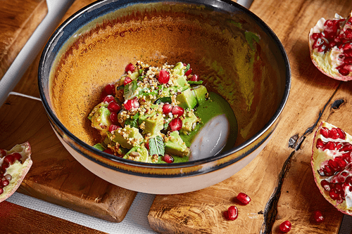 Заправить получившимся соусом, посыпать зернышками граната и сразу подать на стол, пока лед не растаял.