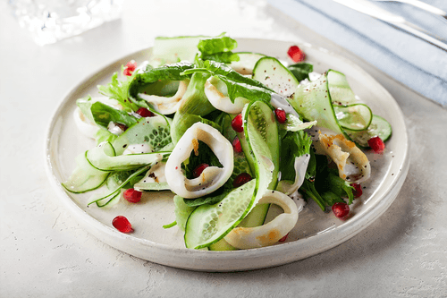 Салатные листья выложить на тарелку, затем ленты из огурца и сметанный соус. Сверху разложить кольца кальмара. Посыпать зернами граната и специей сумах. Сбрызнуть соусом наршараб.