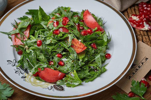 Выложить в большое блюдо, посыпать зернами граната, приправить сванской солью и полить соусом наршараб.