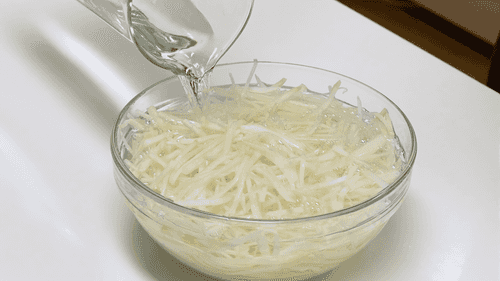 Дайкон очистить и нарезать тонкой соломкой. Залить его теплой водой, посолить и помять руками, затем слить воду через сито.