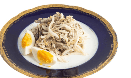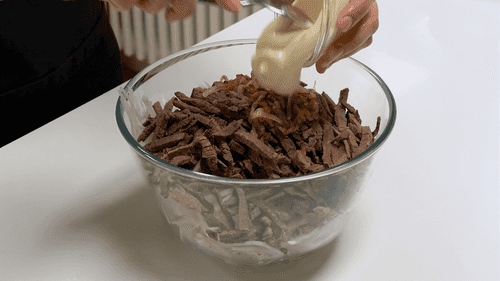 Смешать мясо, дайкон и лук с майонезом, посолить, если это необходимо.