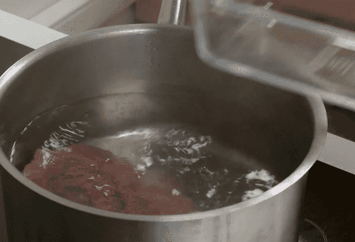 Мясо промыть и положить в кипящую воду, добавить перец горошком и лавровый лист. Варить 1,5 часа, снимая пену.