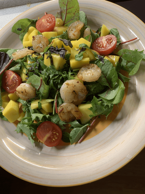 Зеленый салат с креветками и манго