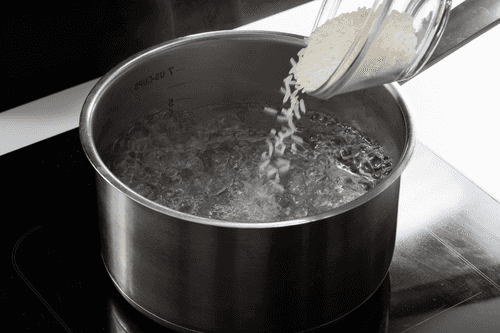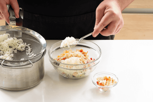 Рис бросить в кипящую подсоленную воду, варить 10–12 минут, затем слить через сито и дать остыть.