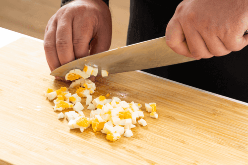 Нарезать огурец, редиску и вареное вкрутую яйцо кубиком размером чуть меньше зерен кукурузы.