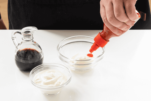 Смешать майонез, йогурт, соевый соус и шрирачу. Подсолить соус.