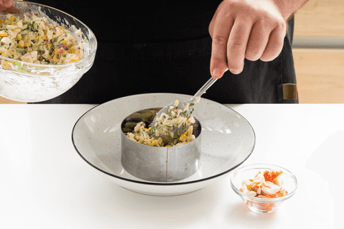 Смешать все подготовленные овощи с рисом и кукурузой. Нарвать мясо краба руками, избавив его от хитина, который может попасться в мясе. Красивые большие кусочки мяса отложить для подачи.