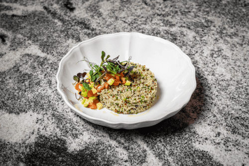 Автор рецепта — Руслан Поляков, шеф-повар ресторана Pino. В этом варианте ближневосточного салата табуле используются киноа, дополненные мелко нарезанными овощами и зеленью. Однако в этом рецепте присутствует и авокадо, что добавляет сытности к легкому салату. Это блюдо идеально подходит для тех, кто придерживается здорового питания, и станет отличным выбором для вегетарианцев.
